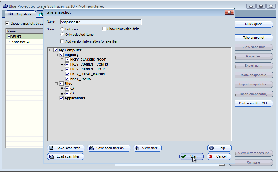 1.5 输入快照名称,保持默认Snapshot #1即可。在复选框中勾选需要做快照的参数。点击Start开始。